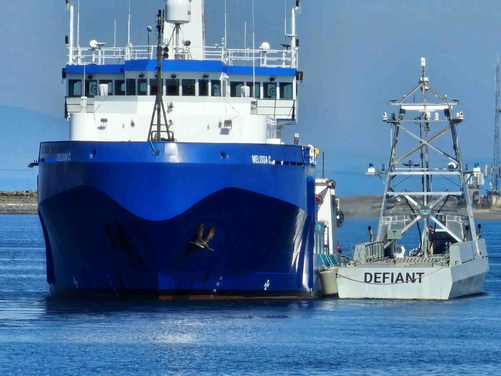In the morning, tethered together, Melissa C escorted Defiant out of dock.