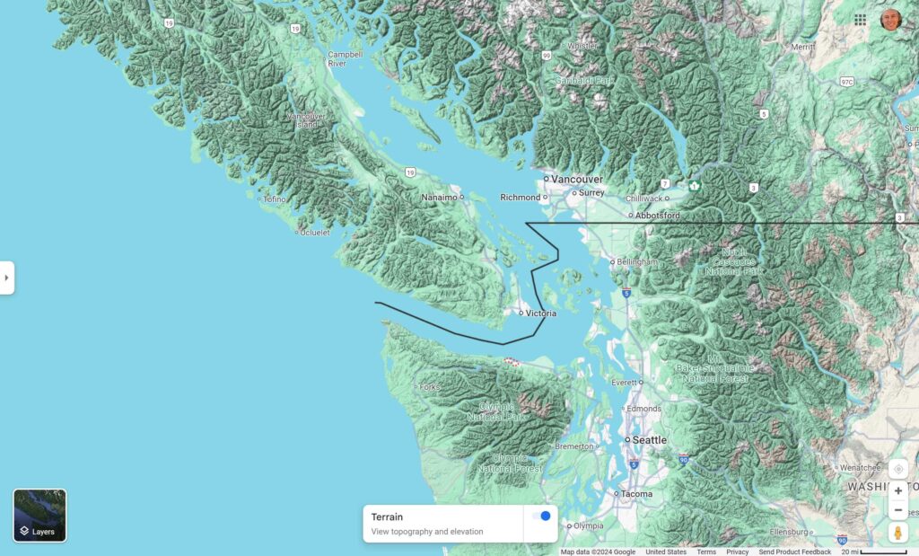 The Strait of Juan de Fuca is primarily bordered by the southern end of Vancouver and the north end of the Olympic Peninsula. It’s about 96 miles long, about 12-25 miles wide, and is part of the Salish Sea, and was filled with glaciers up to a mile thick in the last Ice Age. The Salish Sea is all the inland water in the picture below. It extends up into British Columbia and down into Washington State.
